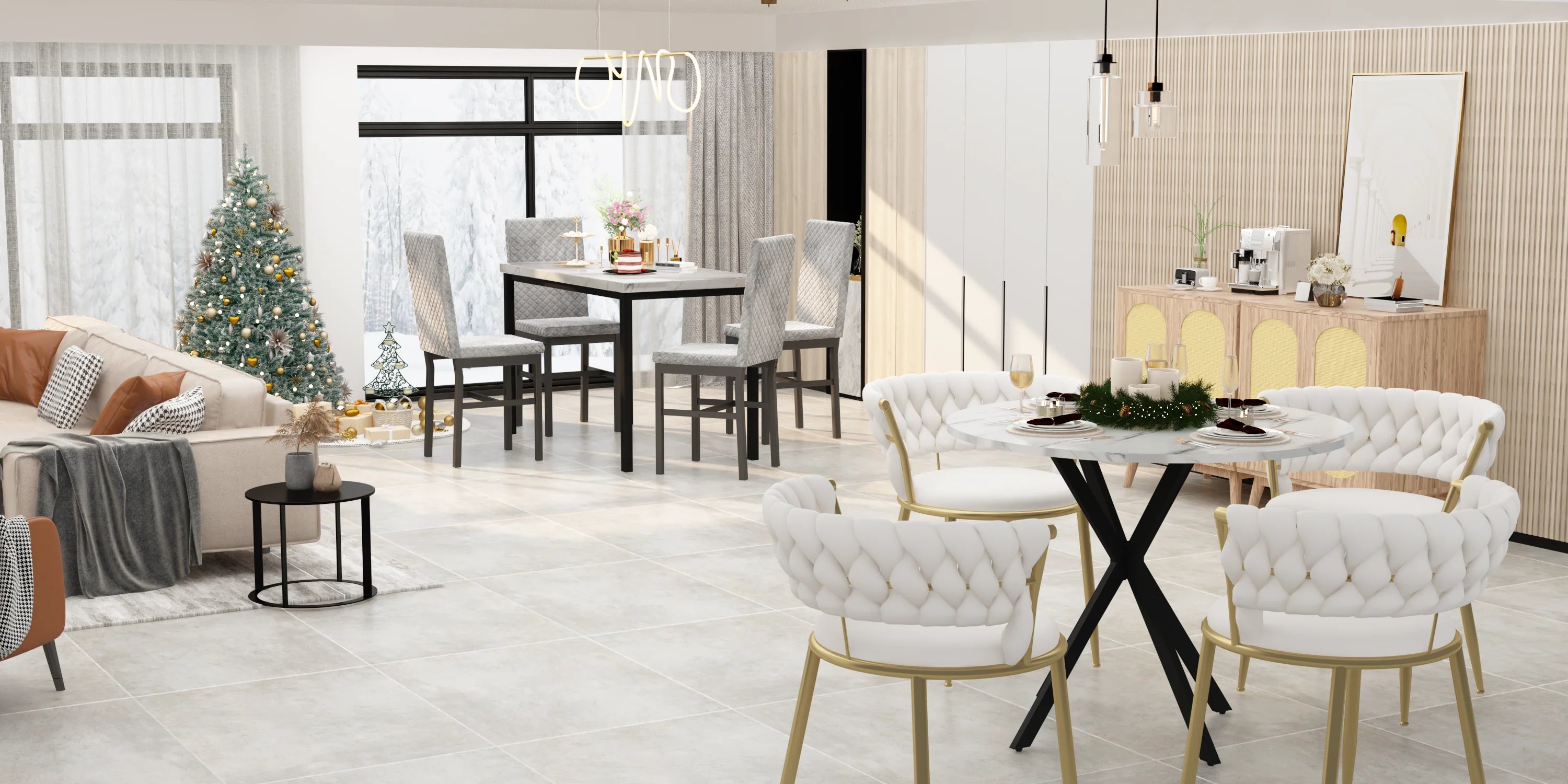 LTTROMAT 5 Piece Dining Table Set, Kitchen Table and Chairs Set for 4 with Faux Marble and 4 Velvet Upholstered Dining Chairs for Home, Restaurant, White & Grey