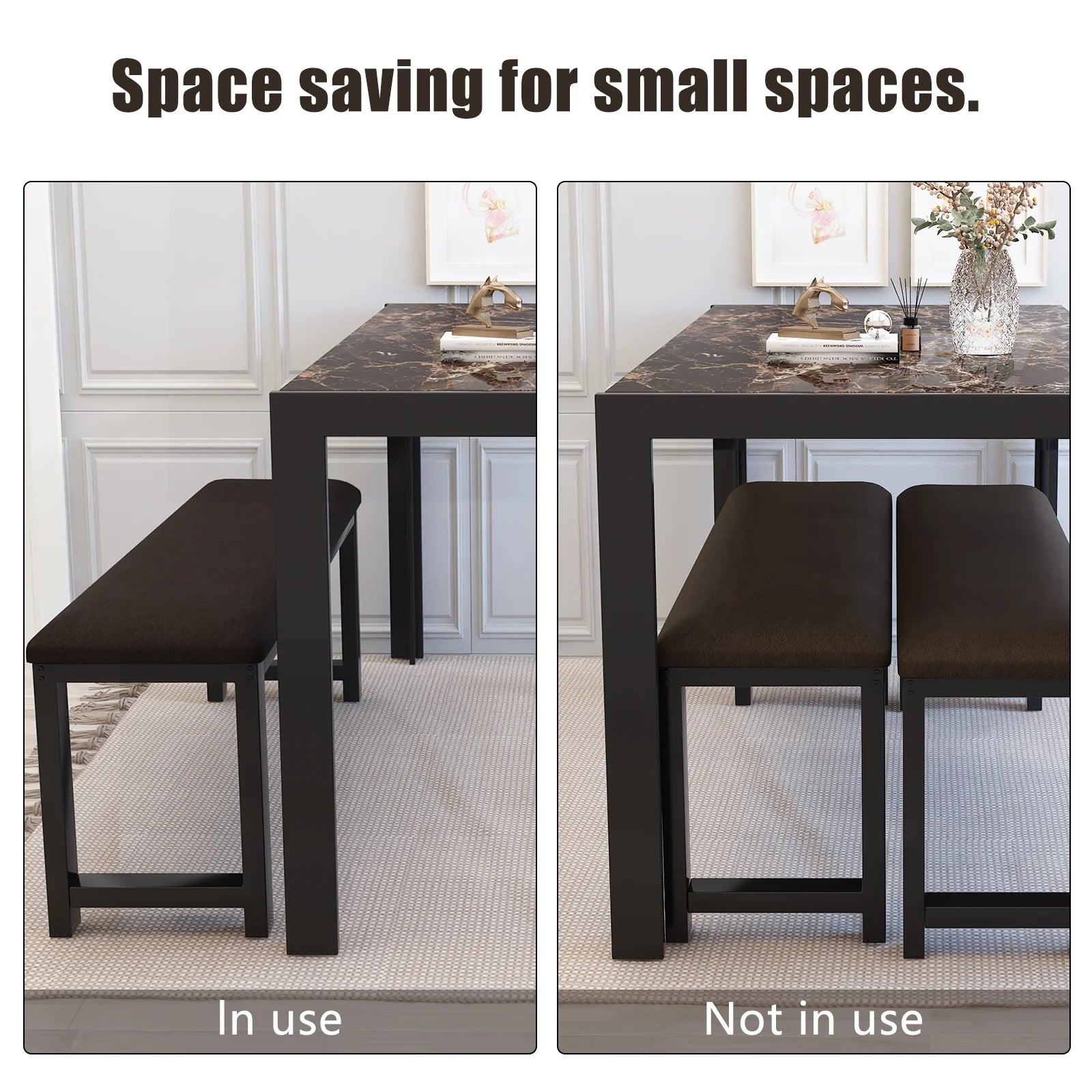 Space-Saving Design:The 2 benches are in dark brown PU leather and the highly elastic upholstered chair brings you comfort. The breakfast chair dimensions of 38.6"W x 11.8"D x 17.5"H allow for easy storage under the breakfast table when not in use. This thoughtful design minimizes clutter and preserves the open feel of your space.